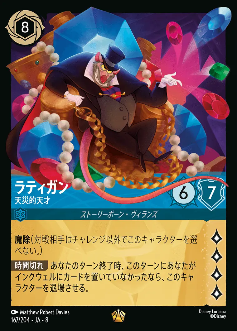 | 魔除(対戦相手はチャレンジ以外でこのキャラクターを選べない。) 【時間切れ】 あなたのターン終了時、このターンにあなたがインクウェルにカードを置いていなかったなら、このキャラクターを退場させる。 | ||