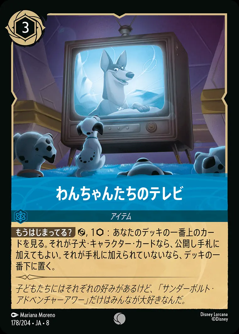 【もうはじまってる?】 ,1 : あなたのデッキの一番上のカードを見る。それが子犬・キャラクター・カードなら、公開し手札に加えてもよい。それが手札に加えられていないなら、デッキの一番下に置く。