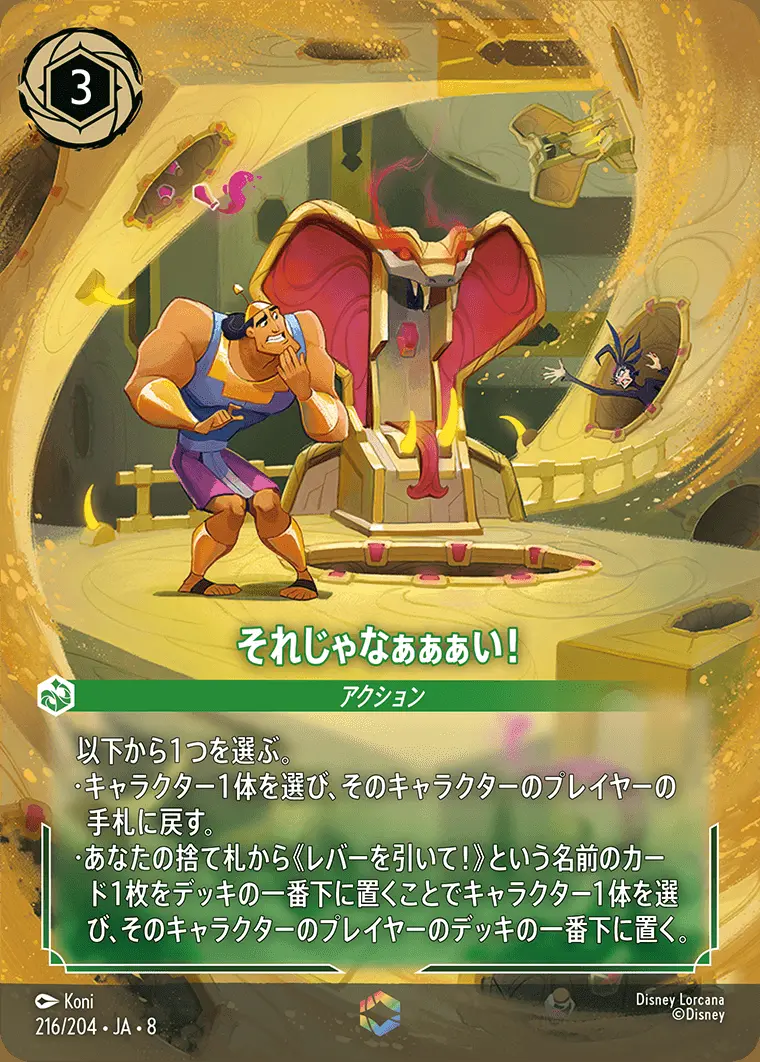 | 以下から1つを選ぶ。 ・キャラクター1体を選び、そのキャラクターのプレイヤーの手札に戻す。 ・あなたの捨て札から《レバーを引いて!》という名前のカード1枚をデッキの一番下に置くことでキャラクター1体を選び、そのキャラクターのプレイヤーのデッキの一番下に置く。 | ||