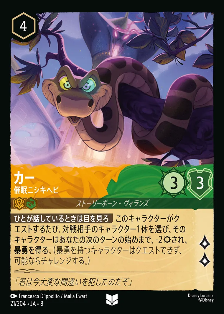【ひとが話しているときは目を見ろ】 このキャラクターがクエストするたび、対戦相手のキャラクター1体を選び、そのキャラクターはあなたの次のターンの始めまで、-2され、暴勇を得る。(暴勇を持つキャラクターはクエストできず、可能ならチャレンジする。)