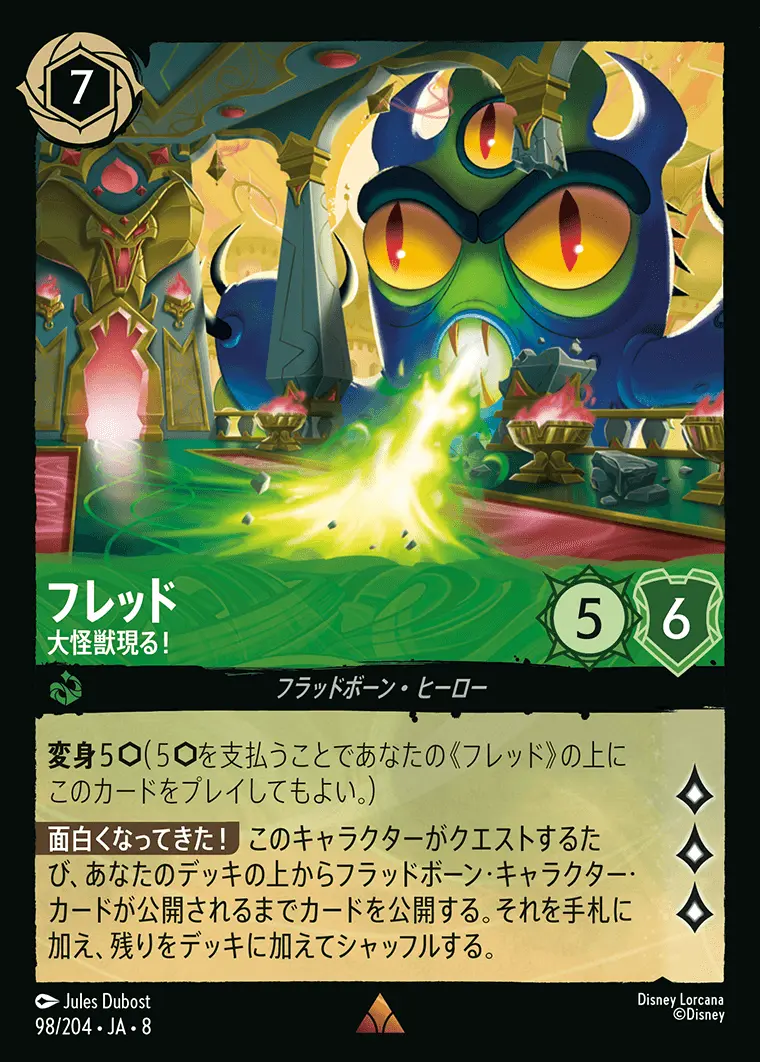 | 変身5(5を支払うことであなたの《フレッド》の上にこのカードをプレイしてもよい。) 【面白くなってきた!】 このキャラクターがクエストするたび、あなたのデッキの上からフラッドボーン・キャラクター・カードが公開されるまでカードを公開する。それを手札に加え、残りをデッキに加えてシャッフルする。 | ||