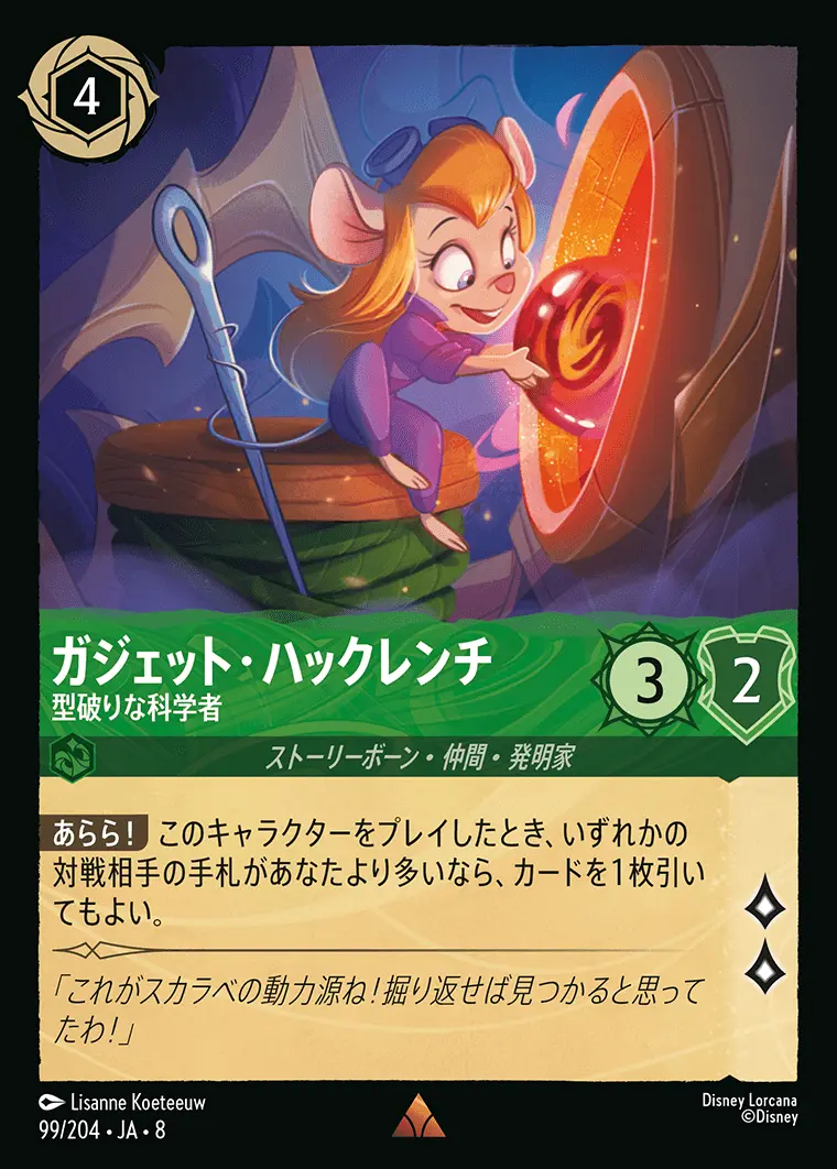 | 【あらら!】 このキャラクターをプレイしたとき、いずれかの対戦相手の手札があなたより多いなら、カードを1枚引いてもよい。 | ||
