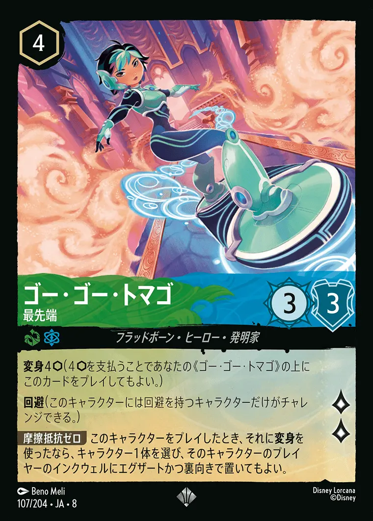 【摩擦抵抗ゼロ】 このキャラクターをプレイしたとき、それに変身を使ったなら、キャラクター1体を選び、そのキャラクターのプレイヤーのインクウェルにエグザートかつ裏向きで置いてもよい。