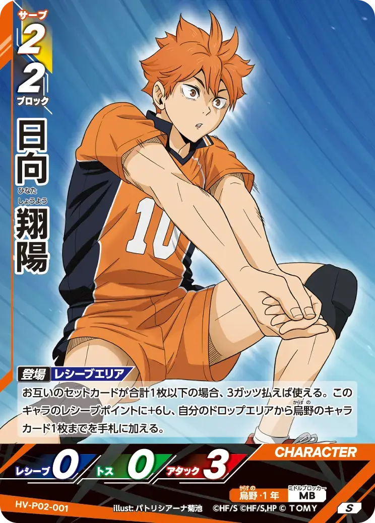 | お互いのセットカードが合計1枚以下の場合、3ガッツ払えば使える。このキャラのレシーブポイントに+6し、自分のドロップエリアから烏野のキャラカード1枚までを手札に加える。 - | ||