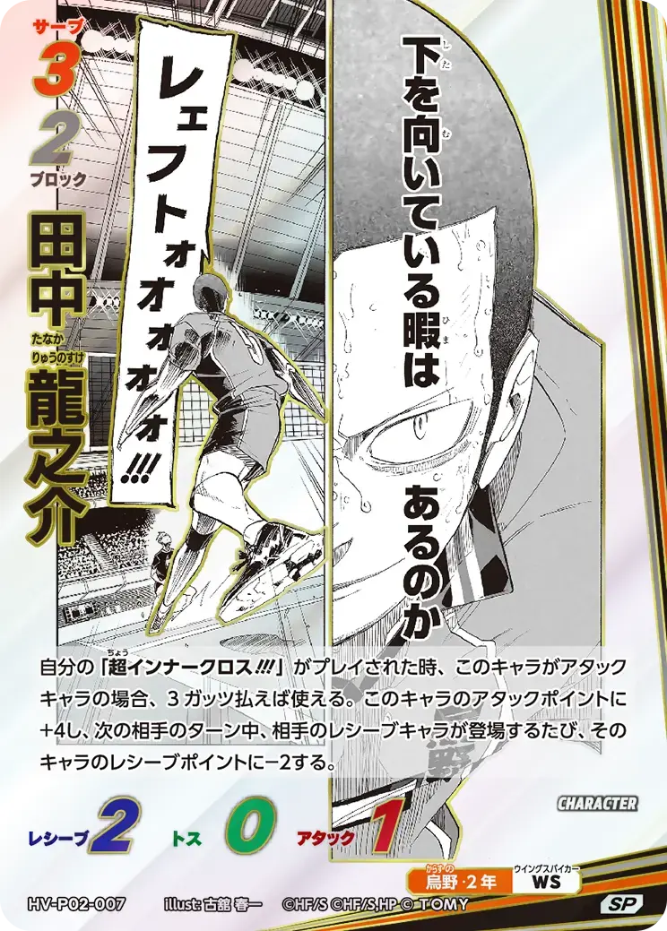 | 自分の「超インナークロス!!!」がプレイされた時、このキャラがアタックキャラの場合、3ガッツ払えば使える。このキャラのアタックポイントに+4し、次の相手のターン中、相手のレシーブキャラが登場するたび、そのキャラのレシーブポイントに-2する。 - | ||