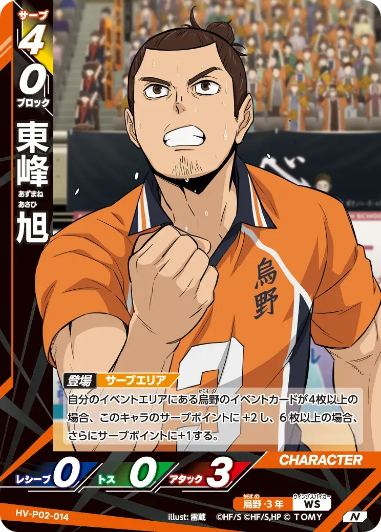 | 自分のイベントエリアにある烏野のイベントカードが4枚以上の場合、このキャラのサーブポイントに+2し、6枚以上の場合、さらにサーブポイントに+1する。 - | ||