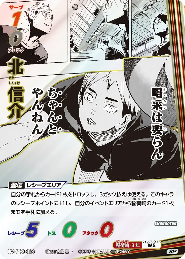 | 自分の手札からカード1枚をドロップし、3ガッツ払えば使える。このキャラのレシーブポイントに+1し、自分のイベントエリアから稲荷崎のカード1枚までを手札に加える。 - | ||