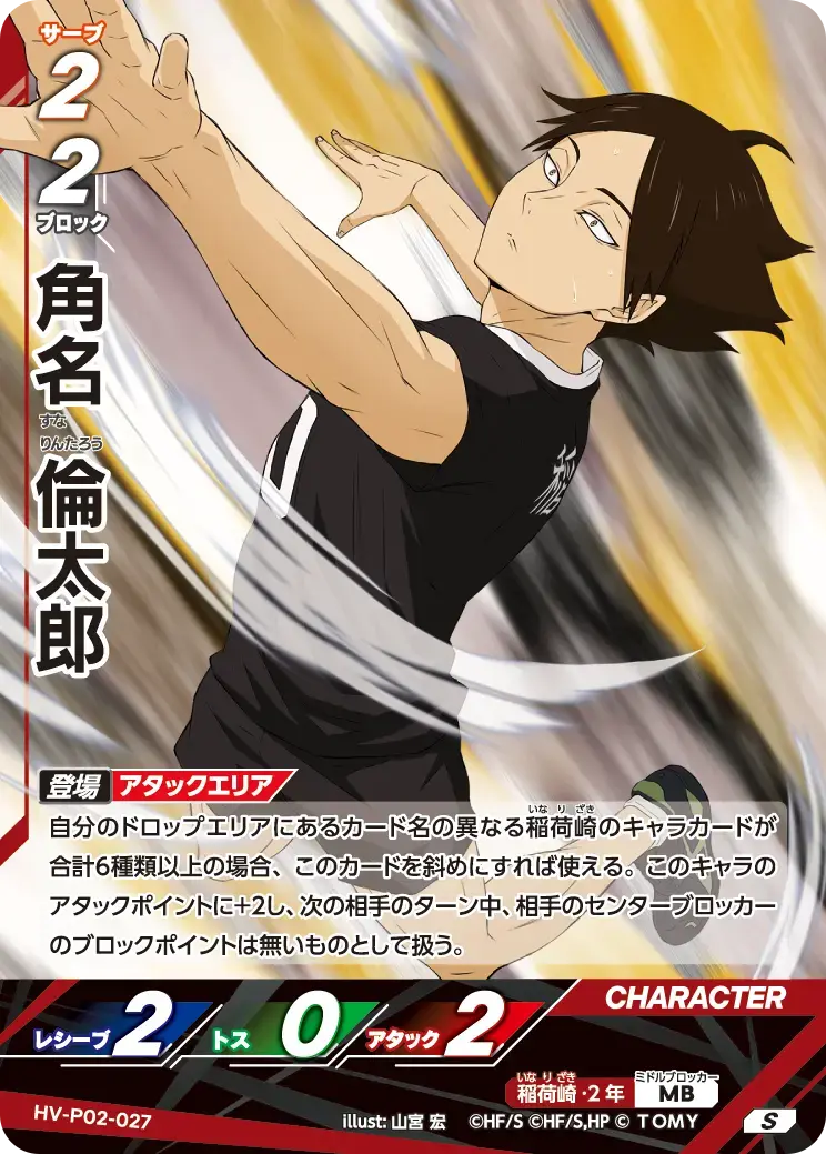| 自分のドロップエリアにあるカード名の異なる稲荷崎のキャラカードが合計6種類以上の場合、このカードを斜めにすれば使える。このキャラのアタックポイントに+2し、次の相手のターン中、相手のセンターブロッカーのブロックポイントは無いものとして扱う。 - | ||