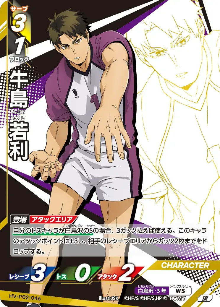 | 自分のトスキャラが白鳥沢のSの場合、3ガッツ払えば使える。このキャラのアタックポイントに+3し、相手のレシーブエリアからガッツ2枚までをドロップする。 - | ||