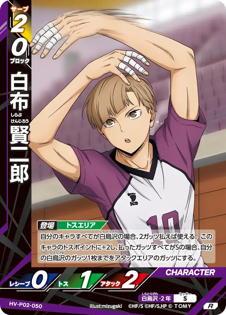 | 自分のキャラすべてが白鳥沢の場合、2ガッツ払えば使える。このキャラのトスポイントに+2し、払ったガッツすべてがSの場合、自分の白鳥沢のガッツ1枚までをアタックエリアのガッツにする。 - | ||