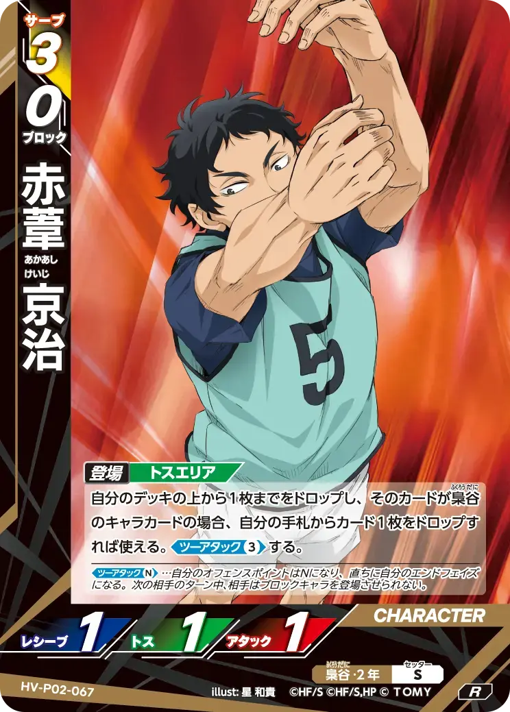 | 自分のデッキの上から1枚までをドロップし、そのカードが梟谷のキャラカードの場合、自分の手札からカード1枚をドロップすれば使える。する。 …自分のオフェンスポイントはNになり、直ちに自分のエンドフェイズになる。次の相手のターン中、相手はブロックキャラを登場させられない。 | ||