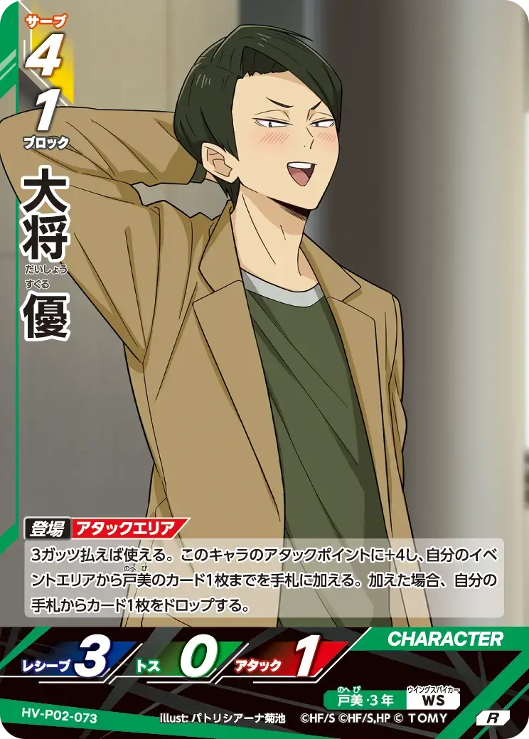 | 3ガッツ払えば使える。このキャラのアタックポイントに+4し、自分のイベントエリアから戸美のカード1枚までを手札に加える。加えた場合、自分の手札からカード1枚をドロップする。 - | ||