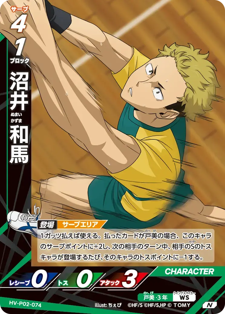 | 1ガッツ払えば使える。払ったカードが戸美の場合、このキャラのサーブポイントに+2し、次の相手のターン中、相手のSのトスキャラが登場するたび、そのキャラのトスポイントに-1する。 - | ||