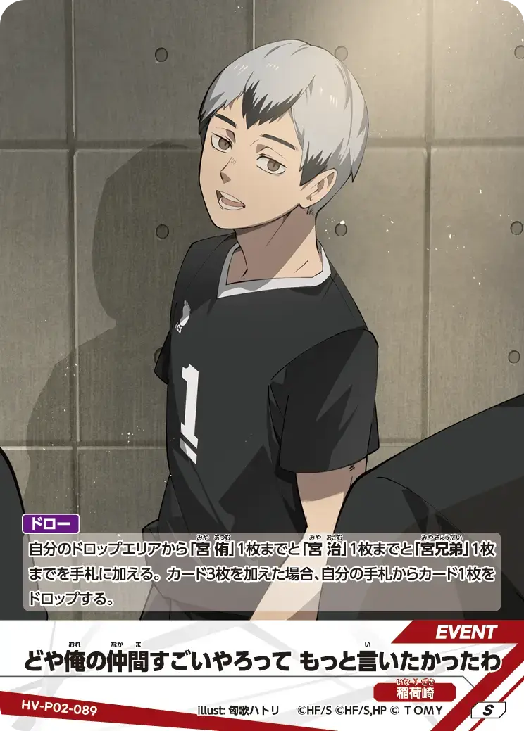 | 自分のドロップエリアから「宮 侑」1枚までと「宮 治」1枚までと「宮兄弟」1枚までを手札に加える。カード3枚を加えた場合、自分の手札からカード1枚をドロップする。 - | ||
