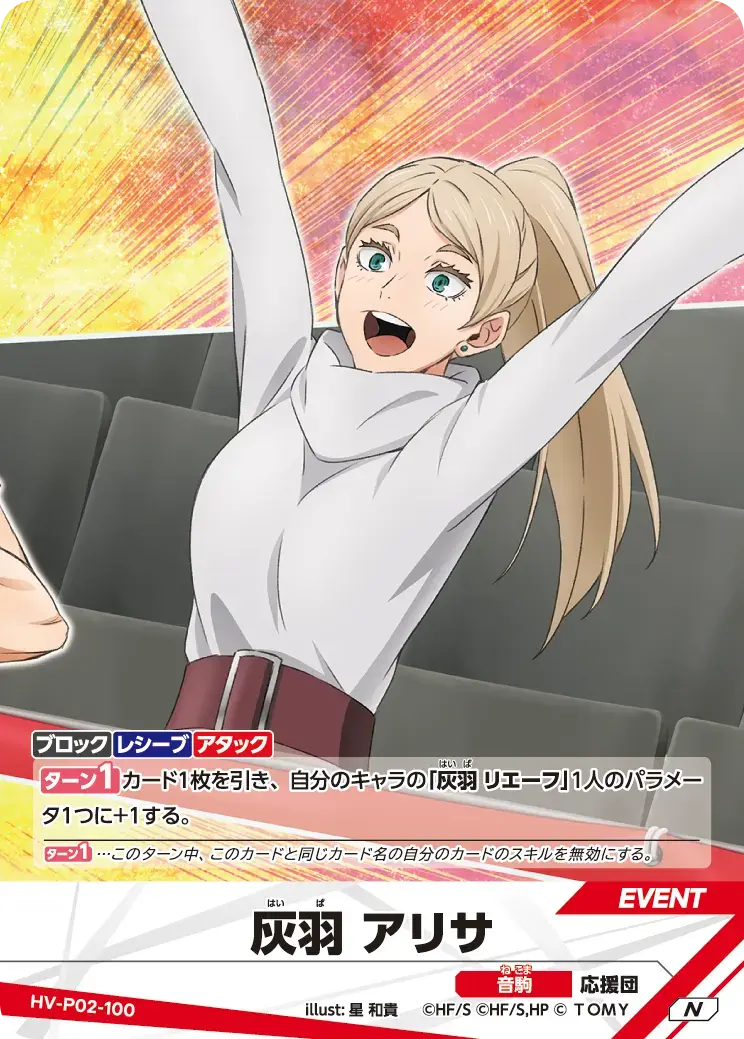 | カード1枚を引き、自分のキャラの「灰羽 リエーフ」1人のパラメータ1つに+1する。 …このターン中、このカードと同じカード名の自分のカードのスキルを無効にする。 | ||