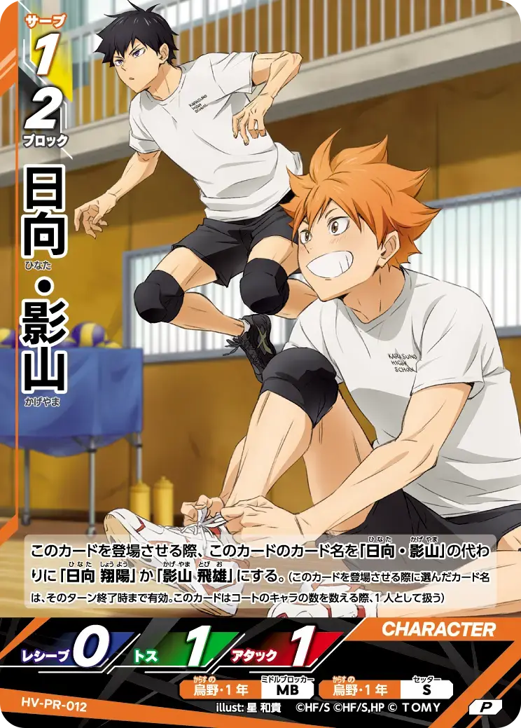 | このカードを登場させる際、このカードのカード名を「日向・影山」の代わりに「日向 翔陽」か「影山 飛雄」にする。(このカードを登場させる際に選んだカード名は、そのターン終了時まで有効。このカードはコートのキャラの数を数える際、1人として扱う) - | ||