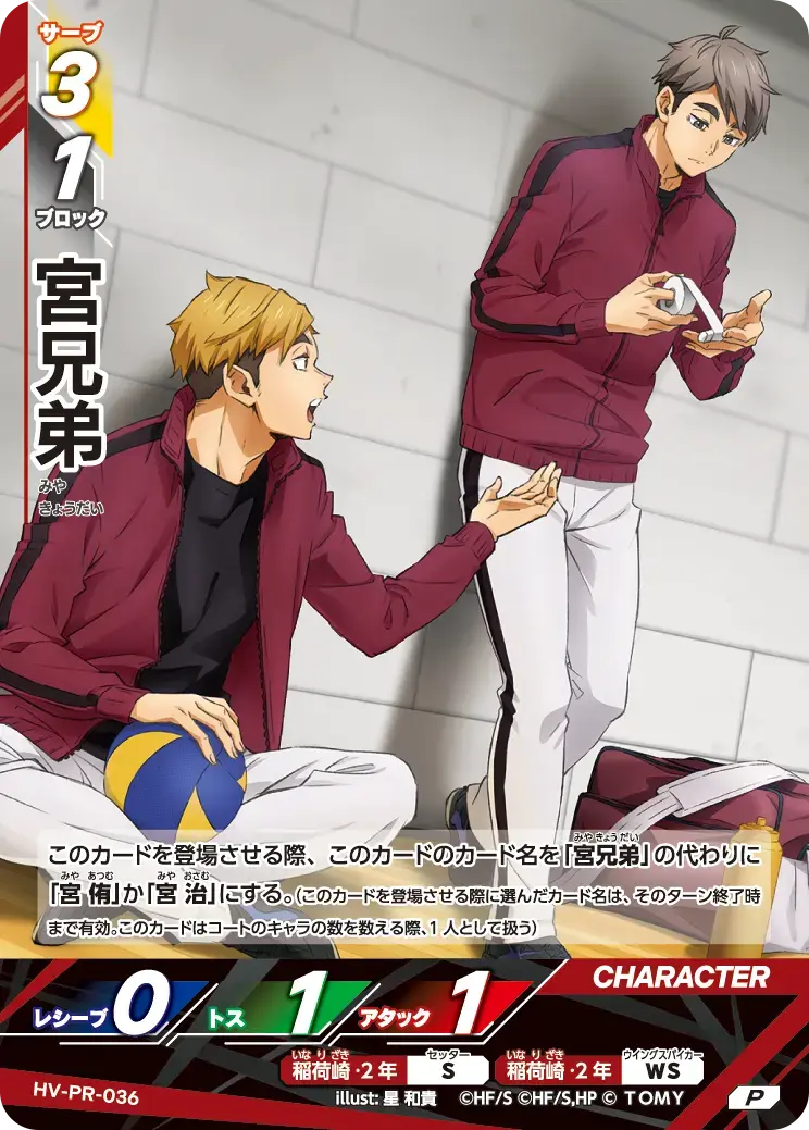 | このカードを登場させる際、このカードのカード名を「宮兄弟」の代わりに「宮 侑」か「宮 治」にする。(このカードを登場させる際に選んだカード名は、そのターン終了時まで有効。このカードはコートのキャラの数を数える際、1人として扱う) - | ||
