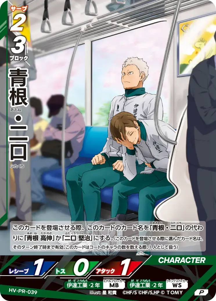 | このカードを登場させる際、このカードのカード名を「青根・二口」の代わりに「青根 高伸」か「二口 堅治」にする。(このカードを登場させる際に選んだカード名は、そのターン終了時まで有効。このカードはコートのキャラの数を数える際、1人として扱う) - | ||