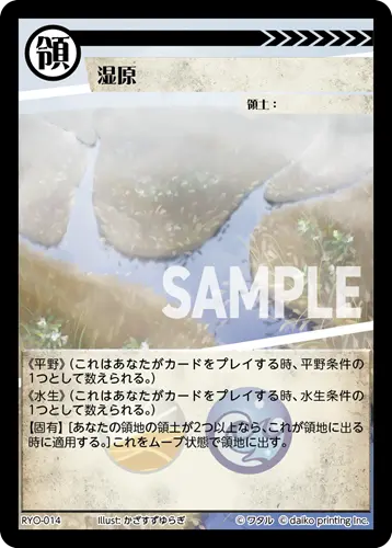 | 《平野》(これはあなたがカードをプレイする時、平野条件の1つとして数えられる。) 《水生》(これはあなたがカードをプレイする時、水生条件の1つとして数えられる。) 【固有】[あなたの領地の領土が2つ以上なら、これが領地に出る時に適用する。]これをムーブ状態で領地に出す。 | ||