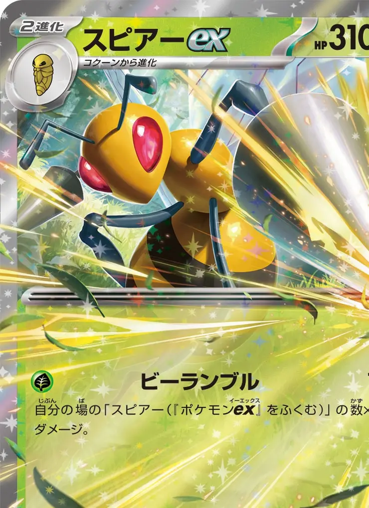 | 【ワザ】 [草] ビーランブル 110× 自分の場の「スピアー(『ポケモンex』をふくむ)」の数×110ダメージ。 【特別なルール】 ポケモンexがきぜつしたとき、相手はサイドを2枚とる。 | ||