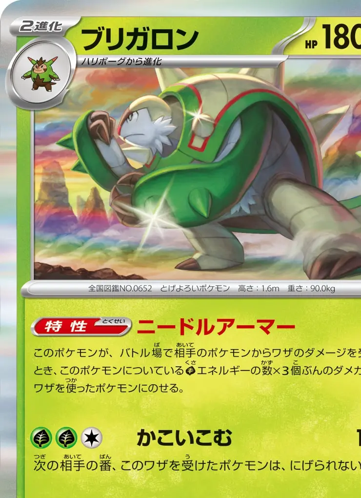 | 【特性】ニードルアーマー このポケモンが、バトル場で相手のポケモンからワザのダメージを受けたとき、このポケモンについている[草]エネルギーの数×3個ぶんのダメカンを、ワザを使ったポケモンにのせる。 【ワザ】 [草][草][無] かこいこむ 160 次の相手の番、このワザを受けたポケモンは、にげられない。 | ||