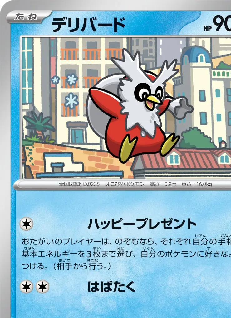 | 【ワザ】 [無] ハッピープレゼント おたがいのプレイヤーは、のぞむなら、それぞれ自分の手札から基本エネルギーを3枚まで選び、自分のポケモンに好きなようにつける。(相手から行う。) [無][無] はばたく 40 | ||