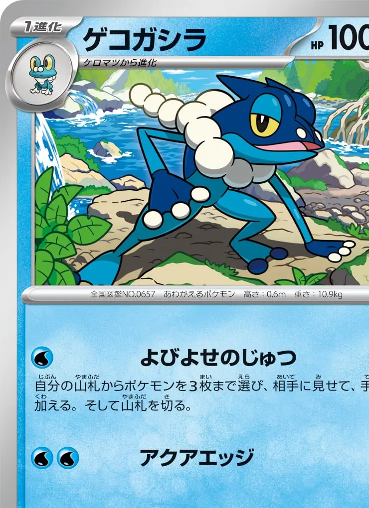 | 【ワザ】 [水] よびよせのじゅつ 自分の山札からポケモンを3枚まで選び、相手に見せて、手札に加える。そして山札を切る。 [水][水] アクアエッジ 50 | ||