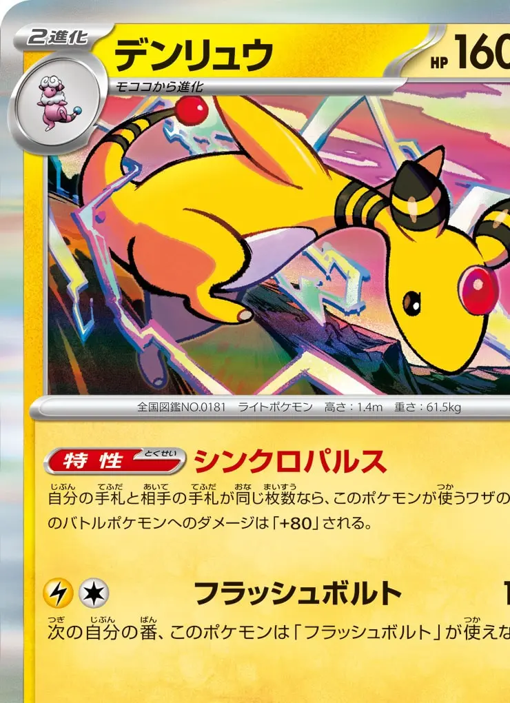 | 【特性】シンクロパルス 自分の手札と相手の手札が同じ枚数なら、このポケモンが使うワザの、相手のバトルポケモンへのダメージは「+80」される。 【ワザ】 [雷][無] フラッシュボルト 140 次の自分の番、このポケモンは「フラッシュボルト」が使えない。 | ||