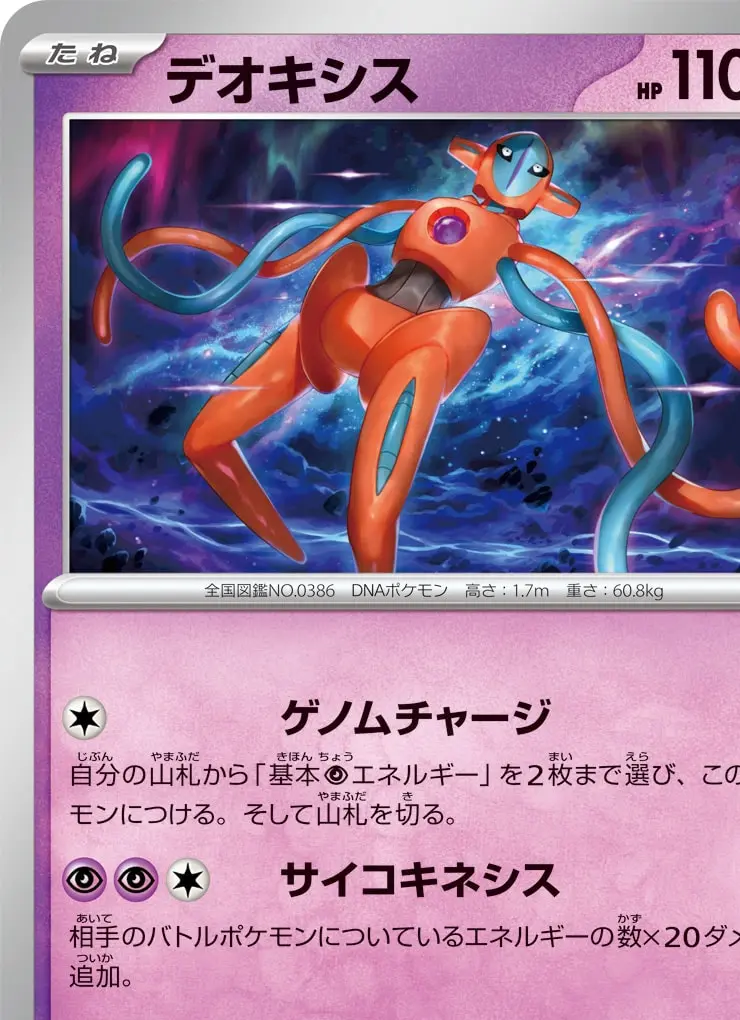 | 【ワザ】 [無] ゲノムチャージ 自分の山札から「基本エネルギー」を2枚まで選び、このポケモンにつける。そして山札を切る。 [超][超][無] サイコキネシス 80+ 相手のバトルポケモンについているエネルギーの数×20ダメージ追加。 | ||