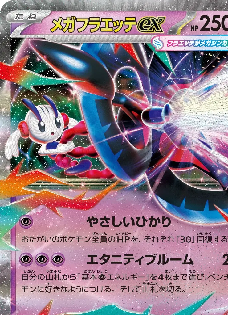 | 【ワザ】 [超] やさしいひかり おたがいのポケモン全員のHPを、それぞれ「30」回復する。 [超][超][超] エタニティブルーム 200 自分の山札から「基本エネルギー」を4枚まで選び、ベンチポケモンに好きなようにつける。そして山札を切る。 【特別なルール】 メガシンカexがきぜつしたとき、相手はサイドを3枚とる。 | ||