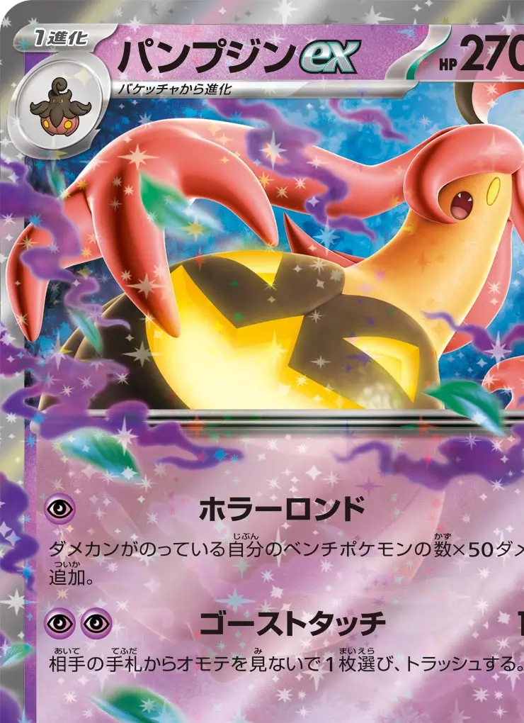 | 【ワザ】 [超] ホラーロンド 30+ ダメカンがのっている自分のベンチポケモンの数×50ダメージ追加。 [超][超] ゴーストタッチ 140 相手の手札からオモテを見ないで1枚選び、トラッシュする。 【特別なルール】 ポケモンexがきぜつしたとき、相手はサイドを2枚とる。 | ||