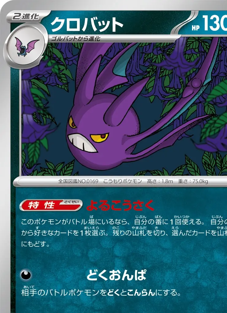 | 【特性】よるこうさく このポケモンがバトル場にいるなら、自分の番に1回使える。自分の山札から好きなカードを1枚選ぶ。残りの山札を切り、選んだカードを山札の上にもどす。 【ワザ】 [悪] どくおんぱ 80 相手のバトルポケモンをどくとこんらんにする。 | ||