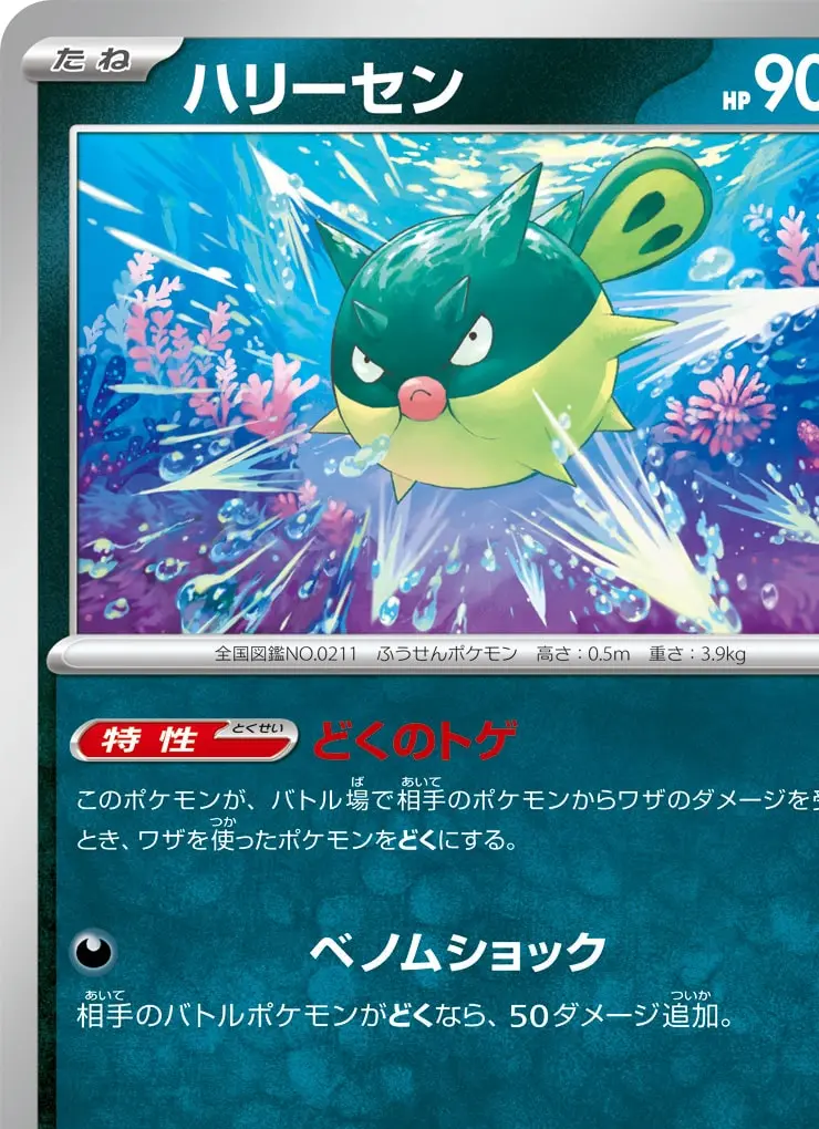 | 【特性】どくのトゲ このポケモンが、バトル場で相手のポケモンからワザのダメージを受けたとき、ワザを使ったポケモンをどくにする。 【ワザ】 [悪] ベノムショック 30+ 相手のバトルポケモンがどくなら、50ダメージ追加。 | ||