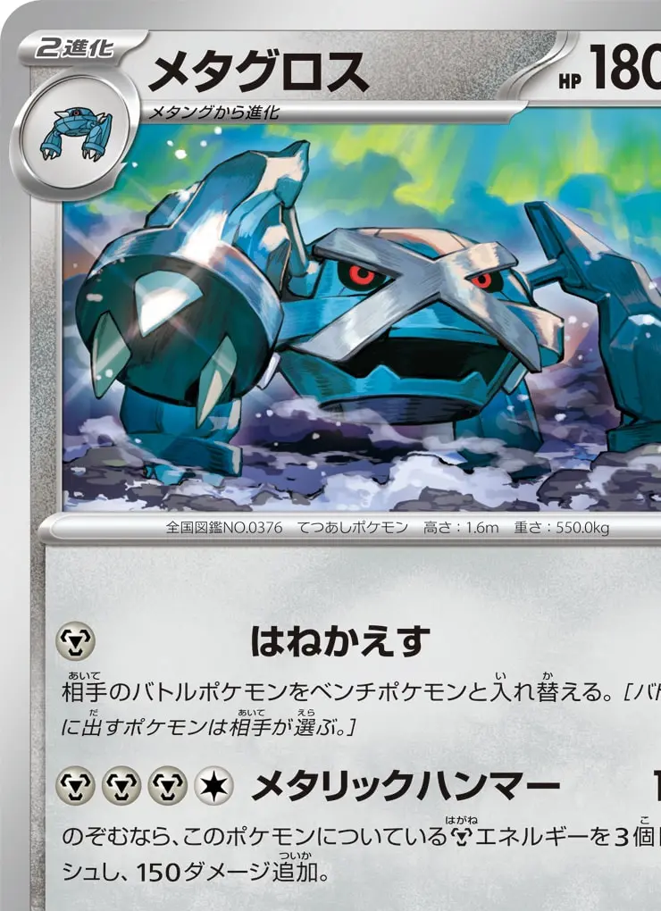 | 【ワザ】 [鋼] はねかえす 60 相手のバトルポケモンをベンチポケモンと入れ替える。[バトル場に出すポケモンは相手が選ぶ。] [鋼][鋼][鋼][無] メタリックハンマー 150+ のぞむなら、このポケモンについているエネルギーを3個トラッシュし、150ダメージ追加。 | ||