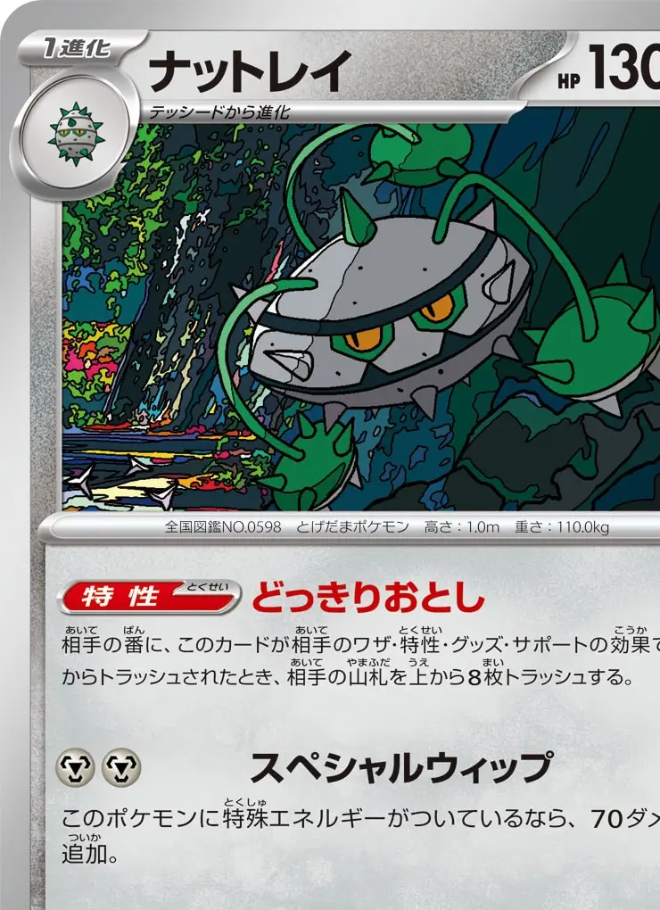 | 【特性】どっきりおとし 相手の番に、このカードが相手のワザ・特性・グッズ・サポートの効果で山札からトラッシュされたとき、相手の山札を上から8枚トラッシュする。 【ワザ】 [鋼][鋼] スペシャルウィップ 70+ このポケモンに特殊エネルギーがついているなら、70ダメージ追加。 | ||