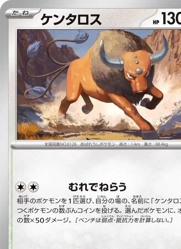 | 【ワザ】 [無][無] むれでねらう 相手のポケモンを1匹選び、自分の場の、名前に「ケンタロス」とつくポケモンの数ぶんコインを投げる。選んだポケモンに、オモテの数×50ダメージ。[ベンチは弱点・抵抗力を計算しない。] | ||