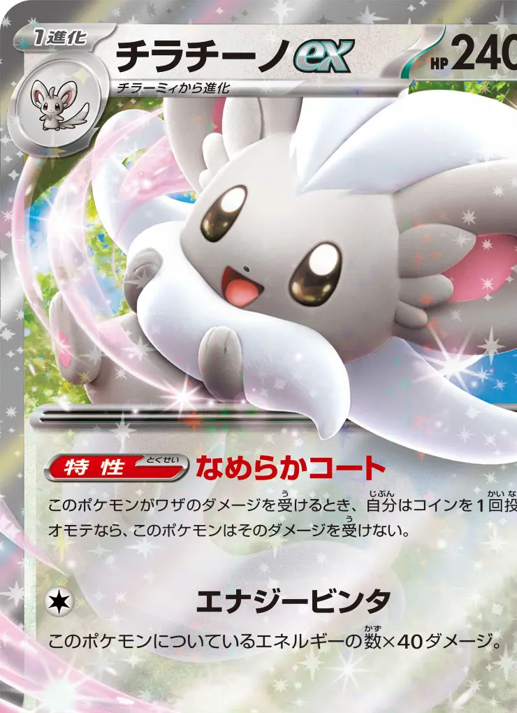 | 【特性】なめらかコート このポケモンがワザのダメージを受けるとき、自分はコインを1回投げる。オモテなら、このポケモンはそのダメージを受けない。 【ワザ】 [無] エナジービンタ 40× このポケモンについているエネルギーの数×40ダメージ。 【特別なルール】 ポケモンexがきぜつしたとき、相手はサイドを2枚とる。 | ||
