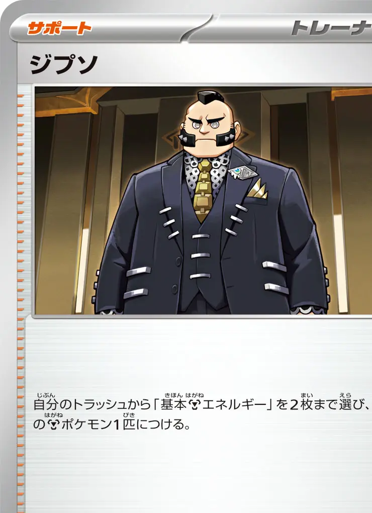 | 【サポート】 自分のトラッシュから「基本エネルギー」を2枚まで選び、自分のポケモン1匹につける。 サポートは、自分の番に1枚しか使えない。 | ||