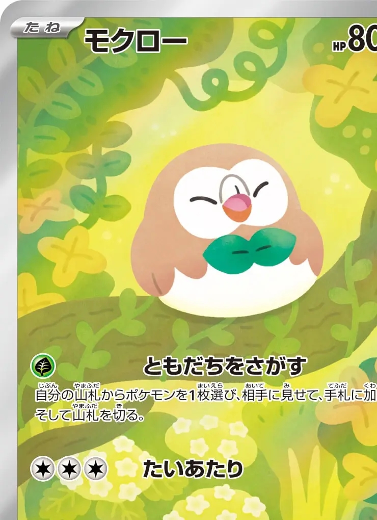| 【ワザ】 [草] ともだちをさがす 自分の山札からポケモンを1枚選び、相手に見せて、手札に加える。そして山札を切る。 [無][無][無] たいあたり 30 | ||