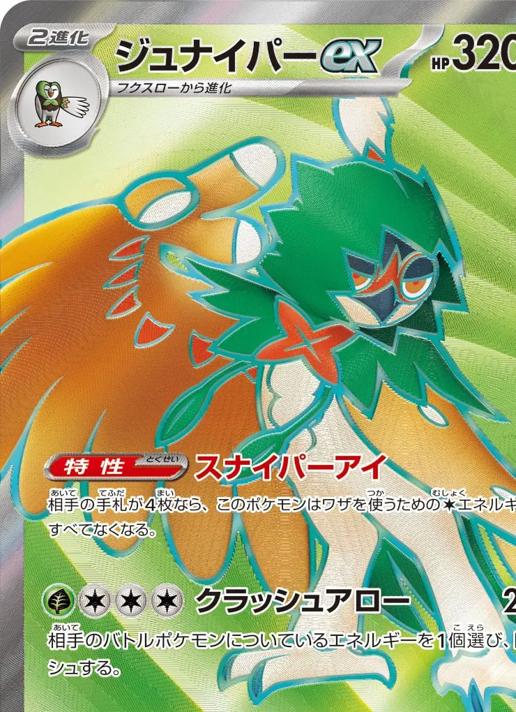 | 【特性】スナイパーアイ 相手の手札が4枚なら、このポケモンはワザを使うための[無]エネルギーが、すべてなくなる。 【ワザ】 [草][無][無][無] クラッシュアロー 240 相手のバトルポケモンについているエネルギーを1個選び、トラッシュする。 【特別なルール】 ポケモンexがきぜつしたとき、相手はサイドを2枚とる。 | ||