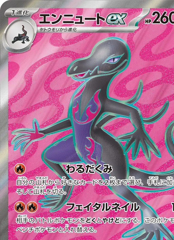 | 【ワザ】 [炎] わるだくみ 自分の山札から好きなカードを2枚まで選び、手札に加える。そして山札を切る。 [炎][炎] フェイタルネイル 100 相手のバトルポケモンをどくとやけどにする。このポケモンをベンチポケモンと入れ替える。 【特別なルール】 ポケモンexがきぜつしたとき、相手はサイドを2枚とる。 | ||