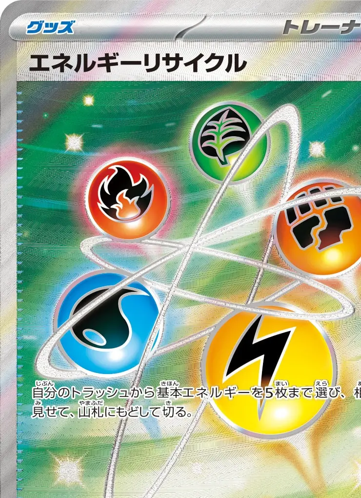 | 【グッズ】 自分のトラッシュから基本エネルギーを5枚まで選び、相手に見せて、山札にもどして切る。 グッズは、自分の番に何枚でも使える。 | ||
