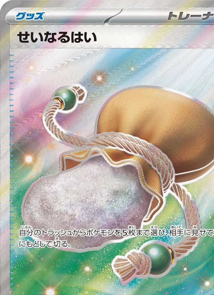 | 【グッズ】 自分のトラッシュからポケモンを5枚まで選び、相手に見せて、山札にもどして切る。 グッズは、自分の番に何枚でも使える。 | ||