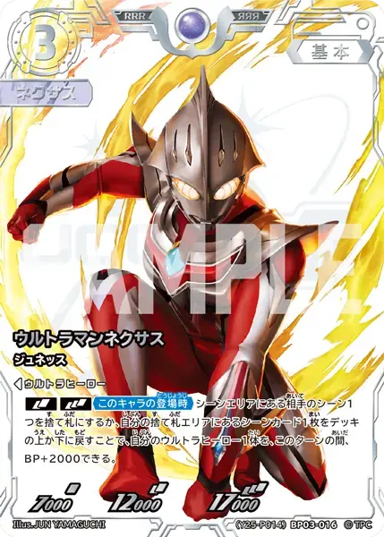 | [DBL][TRP]《このキャラの登場時》シーンエリアにある相手のシーン1つを捨て札にするか、自分の捨て札エリアにあるシーンカード1枚をデッキの上か下に戻すことで、自分のウルトラヒーロー1体を、このターンの間、BP+2000できる。 | ||
