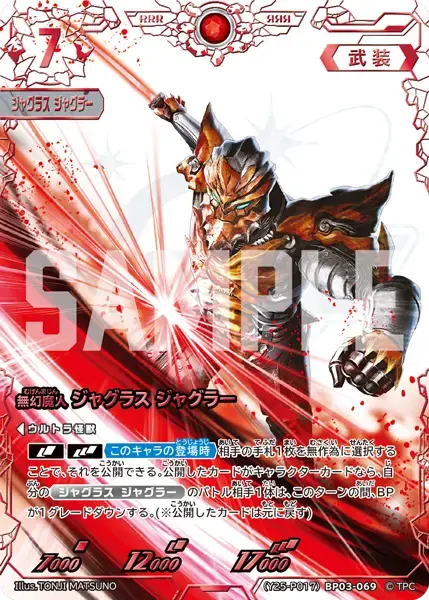 | [DBL][TRP]《このキャラの登場時》相手の手札1枚を無作為に選択することで、それを公開できる。公開したカードがキャラクターカードなら、自分の 『ジャグラス ジャグラー』 のバトル相手1体は、このターンの間、BPが1グレードダウンする。(※公開したカードは元に戻す) | ||