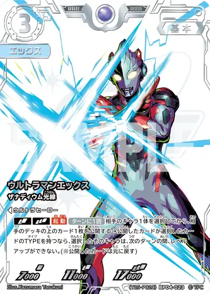 | [DBL][TRP][起動](ターンに1回)相手のキャラ1体を選択してから、相手のデッキの上のカード1枚を公開する→公開したカードが選択したカードのTYPEを持つなら、選択したそのキャラは、次のターンの間、レベルアップができない。(※公開したカードは元に戻す) | ||