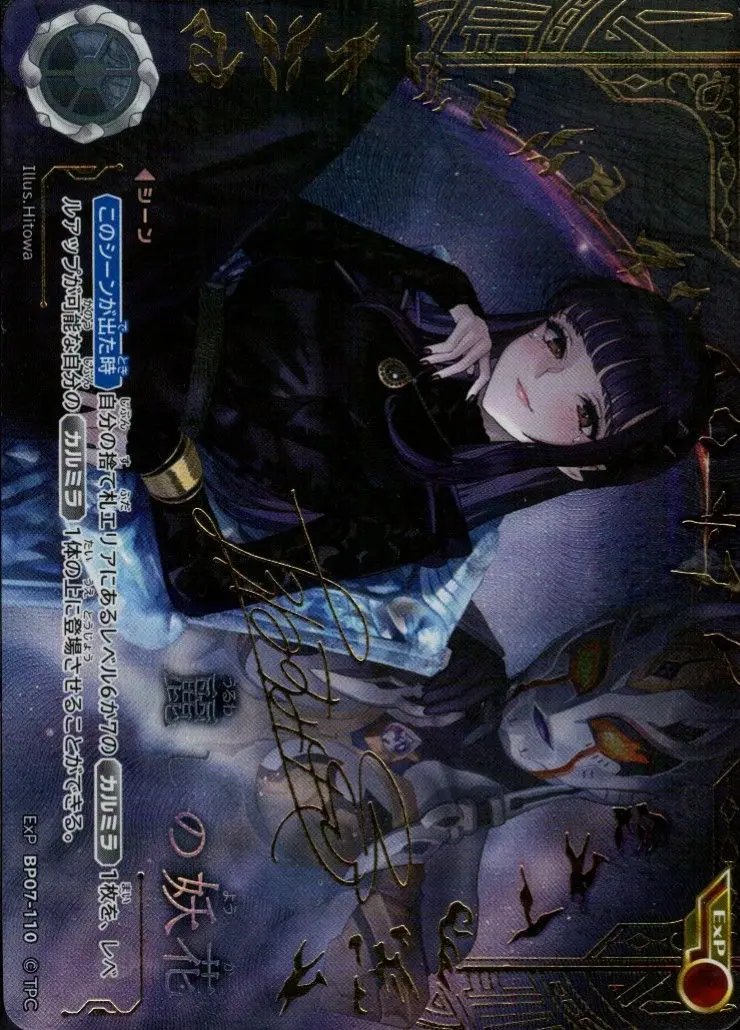 | 《このシーンが出た時》自分の捨て札エリアにあるレベル6か7の 『カルミラ』 1枚を、 レベルアップが可能な自分の 『カルミラ』 1体の上に登場させることができる。 | ||