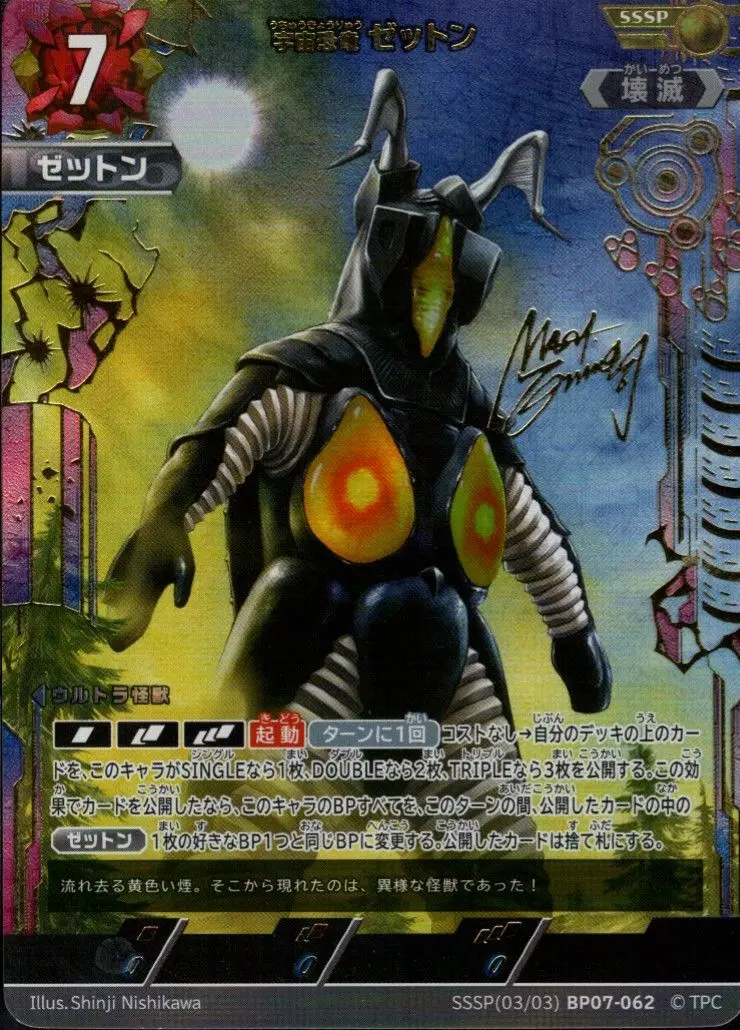 | [SIN][DBL][TRP][起動](ターンに1回)コストなし→自分のデッキの上のカードを、このキャラがSINGLEなら1枚、DOUBLEなら2枚、TRIPLEなら3枚を公開する。この効果でカードを公開したなら、このキャラのBPすべてを、このターンの間、公開したカードの中の『ゼットン』1枚の好きなBP1つと同じBPに変更する。公開したカードは捨て札にする。 | ||