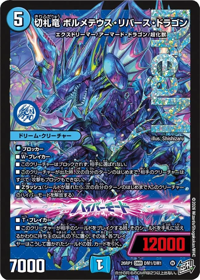 | ■ ブロッカー ■ W・ブレイカー ■ このクリーチャーはブロックされず、相手に選ばれない。 ■ このクリーチャーが出た時、次の自分のターンのはじめまで、相手のクリーチャーはすべて、攻撃もブロックもできない。 ■ Zラッシュ(シールドが離れたら、次の自分のターンのはじめまで、このクリーチャーのハイパーモードを解放する) | ||